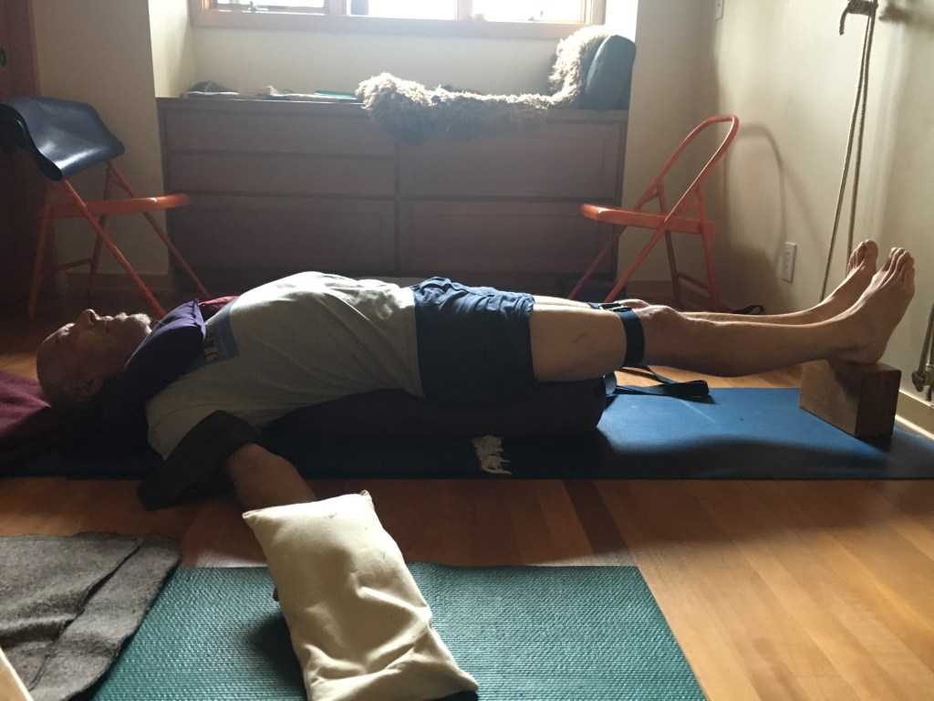 Homework poses: gomukhasana arms, trikonasana, supta baddha konasana